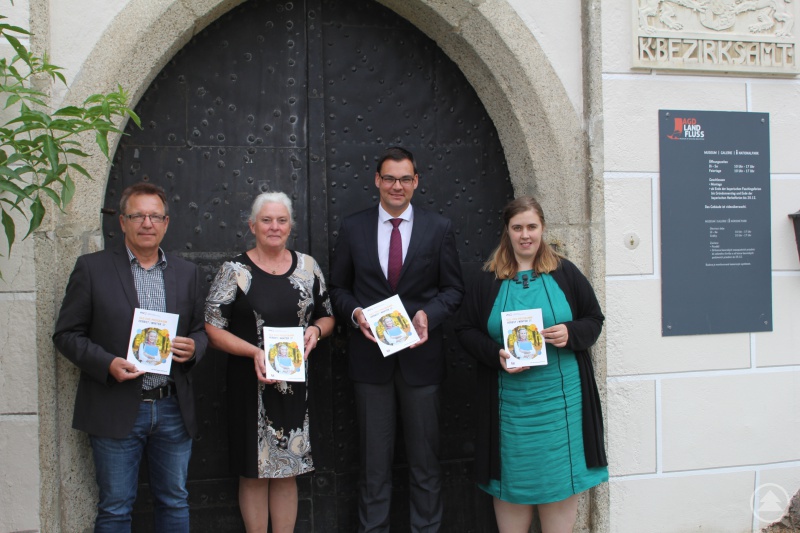 Sie präsentieren vor Schloss Wolfstein das neue Semesterprogramm Herbst-Winter 2016/17 der Volkshochschule des Landkreises (v.l.n.r.): vhs-Geschäftsführer Michael Dietz, Ehrenamtliche vhs-Leiterin Anna Mitterdorfer, Landrat Sebastian Gruber und Stv. vhsGeschäftsführerin Miriam Erkens.
