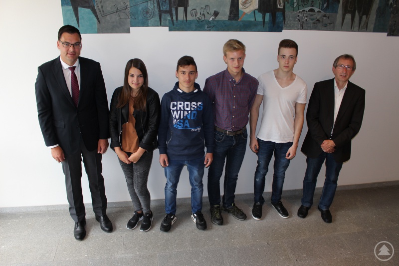 (v.l.) Landrat Sebastian Gruber mit Lena Simet, Nico Küblböck, Michael Kellermann, Michael Philipp und Ludwig Brunner Lena Simet und Michael Kellermann werden zur/zum Verwaltungsfachangestellten, Michael Philipp zum Fachinformatiker Systemintegration und Nico Küblböck zum Straßenwärter ausgebildet.
