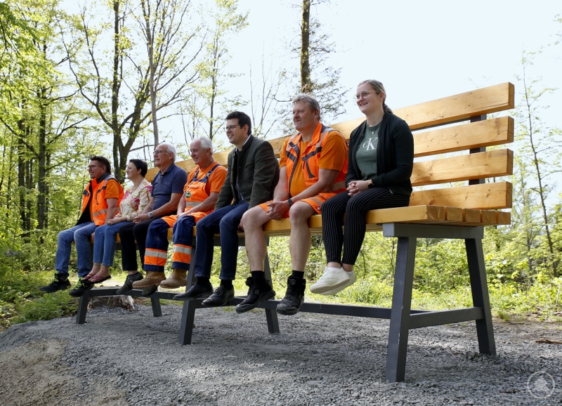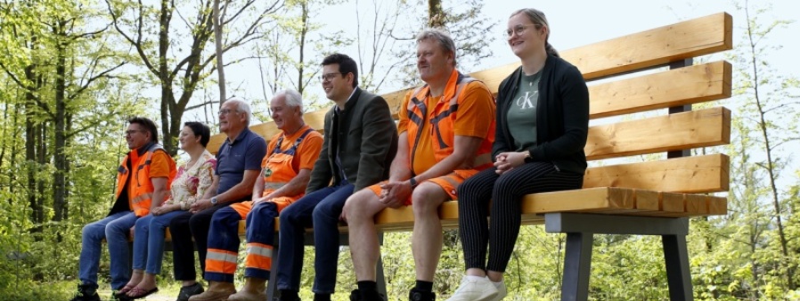 Einen besonderen Anziehungspunkt mehr hat der Kadernberg nun mit einem XXL-Objekt in Bank-Form. Den kommunalen Belastungstest machte ein Team aus Bauhof, Touristikfachfrauen, Rat und Bürgermeister mit (v.r.) Miriam Ertl, Benedikt Mautner, Martin Pichler, Günter Greipl, Günter Klampfl, Veronika Egger und Jürgen Murr.