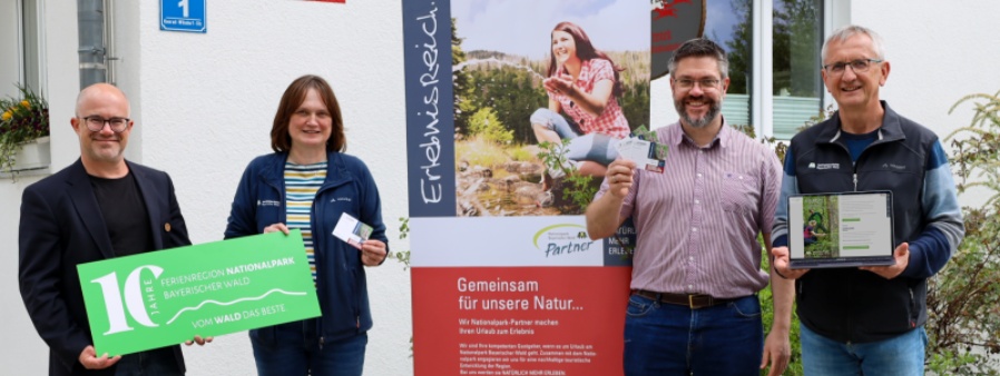 Robert Kürzinger (Geschäftsführer der Ferienregion Nationalpark Bayerischer Wald), Elke Ohland (Nationalpark Bayerischer Wald), Alois Grobauer (Vorsitzender der Nationalpark-Partner) und Josef Wanninger (Nationalpark Bayerischer Wald) präsentieren das neue Erlebnisangebot mit zahlreichen Führungen für die Sommersaison sowie die Gutscheine der Nationalpark-Partnerbetriebe, welche an Gäste und Kunden der Partnerbetriebe ausgegeben werden.
