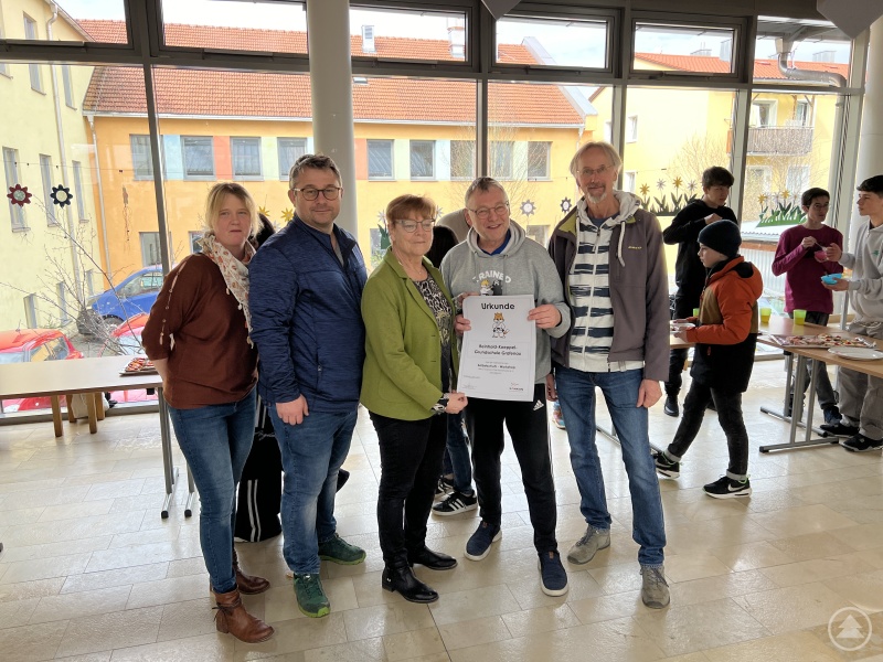Überreichung der Urkunde zum Selbstschutz – Workshop durch Paul Gruber an Frau Weiß, im Beisein des Elternbeiratsvorsitzenden Herrn Kilger und der Klassenlehrer der vierten Klassen, Frau Neugebauer und Herr Schuster.