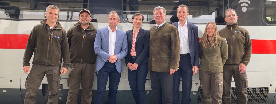 Beim Pressetermin in Plattling umringt von Rangern des Nationalparks Bayerischer Wald v.l.n.r. Thorsten Glauber, Bayerischer Staatsminister für Umwelt und Verbraucherschutz, Ursula Schuster, Leiterin des Nationalparks Bayerischer Wald, Christian Bernreiter, Bayerischer Staatminister für Wohnen, Bau und Verkehr und Klaus-Dieter Josel, Konzernbevollmächtigter der DB in Bayern - Copyright DB AG