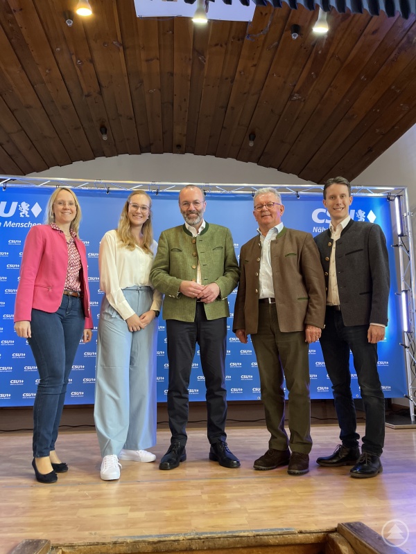 Auf dem Bild ist die Regener CSU Delegation (von links: Dr. Bianca Wildfeuer, Europakandidatin Agnes Brücklmayer, Franz Hollmayr und Florian Wiesmüller) mit dem Spitzenkandidaten der CSU für die Europwahl Manfred Weber.