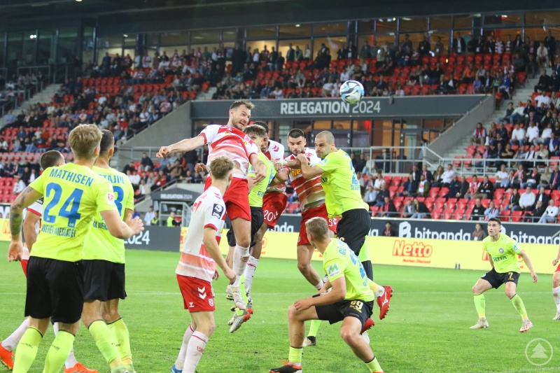 Wiesbadens Trainer Modica Giuliano stellte nun um auf eine Viererkette und wechselte gleich dreimal: Mockenhaupt für den gelbvorbelasteten Angha sowie Günther und Lee für Kovacevic und Bennetts. Die Wechsel fruchteten und seinem Team gehörte die erste Chancen. Ziegele und Gebhardt klärten einen gefährlichen Heber gemeinsam (46.). Günther flankte von links, aber der Kopfball von Agrafiotis segelte weit am Tor vorbei (49.). Nach einem Freistoß von der rechten Seite kam Prtajin per Kopf zum Abschluss, doch Gebhardt lenkte den Ball glänzend über die Latte (53.). Der Jahn konnte die Drangphase in der Folge auflösen, kam aber selbst kaum in Offensivaktionen. Bulic setzt sich auf links gut durch und drang in den Strafraum ein, wo er aber in letztem Moment noch am Abschluss gehindert wurde (65.). In der 66. Minute herrschte Chaos im Strafraum der Regensburger: Breunig blockte zunächst einen Schuss von Prtajin, doch die Wiesbadener spitzelten den Ball von der Torauslinie zurück in die Mitte, wo Heußer richtig stand und den Ausgleich erzielte (66.). In der 72. Minute konnte Gebhardt einen satten Schuss von Prtajin nur nach vorne abprallen lassen. Der erst kurz zuvor eingewechselte Iredale schaltete im anschließenden Durcheinander am schnellsten und bugsierte den Ball per Hacke zum 1:2 über die Linie. Die Jahnelf erholte sich gut von diesem Schock und spielte wieder zielstrebiger nach vorne. Kother schoss einen Volley am Tor vorbei (74.), ehe Breunig frei zum Kopfball kam, aber Iredale auf der Linie rettete (75.). Ballas köpfte kurz darauf nur knapp am Tor vorbei (76.). Bei einer erneuten Offensivaktion täuschte Viet zentral vor dem Tor einen Schuss an, legte aber links rüber auf Kother, der den Ball satt zum 2:2 ins rechte obere Eck einschweißte - ein Traumtor (80.). Nun war wieder Wehen um eine Antwort bemüht: Einen Schuss von Lee parierte Gebhardt per Flugeinlage zur Seite (85.). Geipl verhinderte einen weiteren Abschluss von Lee per Grätsche (87.). In der Nachspielzeit war Wehen mit zwei Spielern im Strafraum, aber Breunig klärte den Querleger mit einer starken Grätsche (90+1.). So blieb es beim insgesamt leistungsgerechten 2:2-Unentschieden. Am Dienstag treffen beide Mannschaften im Rückspiel der Relegation erneut aufeinander. Anpfiff in der Brita-Arena ist um 20.30 Uhr.