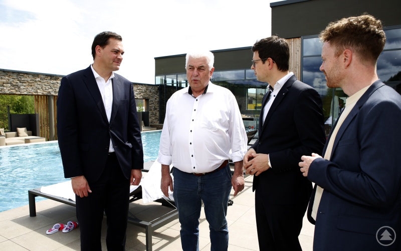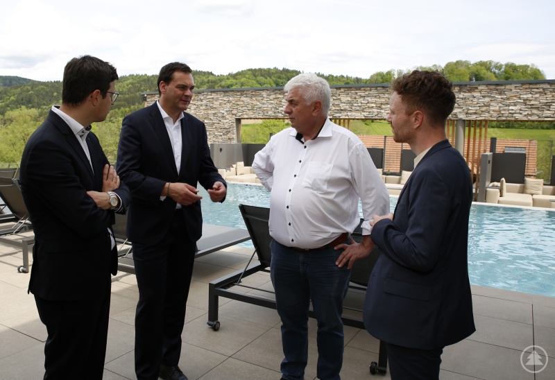 Das fordert zugleich ständige Anpassung und Nachjustierung. Gerade wurde das Restaurant erweitert, damit jede Familie garantiert einen eigenen Tisch hat. Und damit der Weg vom Schwimmbad zu Kaffee und Snack auch ohne extra Umziehen möglich ist, wurde ein Bademantel-Bistro gebaut. Der Besuch von Landrat, Bürgermeister und Wirtschaftsreferent war zum gegenseitigen Austausch geeignet. Sebastian Gruber stellte anerkennend fest, dass der Schreinerhof eines der touristischen Aushängeschilder der Region ist. Daneben war es aber auch ein Arbeitstreffen. Wer viel unternimmt, hat viel mit Planung, Genehmigung, Förderung und vielem mehr zu tun. Schreinerhof, Markt Schönberg und das Landratsamt Freyung-Grafenau sind hierzu im stetigen, konstruktiven Austausch. „Die Entwicklung des Schreinerhofs ist beeindruckend, genauso aber auch die Tatkraft, das Engagement und der Mut der Unternehmerfamilie Schon. Das Familotel gehört zweifellos zu den touristischen Aushängeschildern der Region“, unterstrich Landrat Sebastian Gruber.