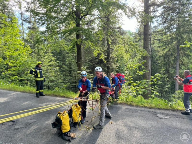 Die eingeklemmte Person wurde mittel Hebekissen durch die Feuerwehr geborgen, dann mit der Gebirgstrage und dem Statikseilsatz aus dem abschüssigen Gelände nach der Erstversorgung durch die Bergwacht gerettet.