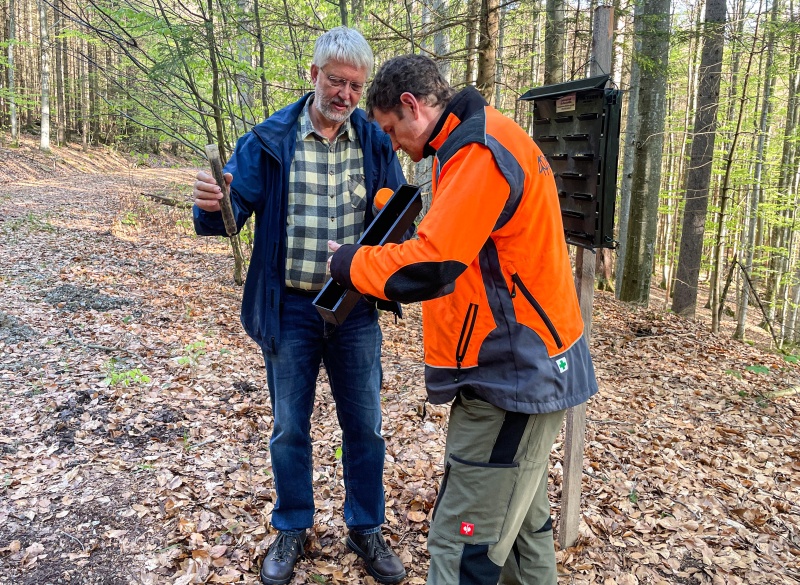 Ingo Brauer, Leiter der Nationalparkdienststelle Scheuereck und Martin Scholz, stellvertretender Leiter des Sachgebietes Wald- und Flächenmanagement erklären im Podcast das Borkenkäfermonitoring und die Suche nach befallenen Fichten in der Managementzone