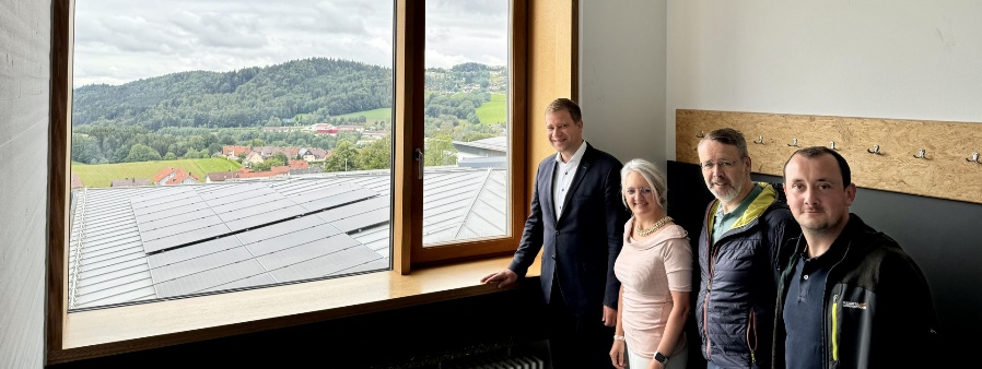 v.l.n.r.: Mit Aussicht auf einen Teil der neuen PV-Anlage auf der Mittelschule Freyung: Bürgermeister Dr. Olaf Heinrich, Schulleiterin Cornelia Miggisch, stv. Vorsitzender des Hauptschulverbandes Jürgen Schano und Klimaschutzmanager der Stadt Freyung Ludwig König