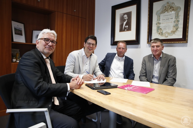Bürgermeister Martin Pichler unterzeichnete den Gigabit-Ausbau-Vertrag mit Telekom-Regionalmanager Markus Münch (l.), Josef Markl (v.r.) von der begleitenden IK-T GmbH und mit Geschäftsleiter Helmut Hörtreiter.