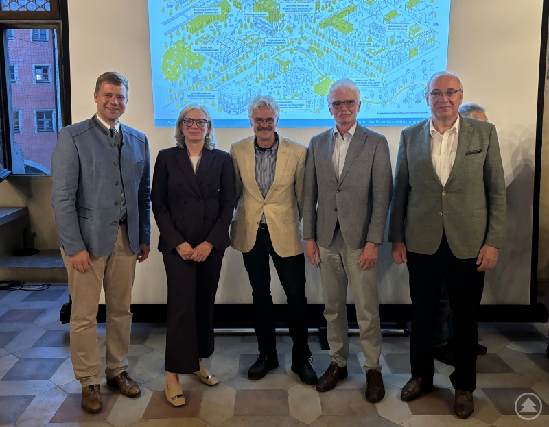 Die Präsidentin der Bundesarchitektenkammer und Vorstandsmitglied des Landesvereins für Heimatpflege Andrea Gebhard hielt die Festansprache zum Bayerischen Heimattag 2024. Sie ging insbesondere auf die Möglichkeiten einer gezielten städteplanerischen Herangehensweise zur Schaffung „grüner“ und „blauer Infrastruktur“ in historischen Stadtzentren ein. Eine Transformation von der steinernen zur grünen Stadt sei auch in bestehenden Quartieren ohne Baulücken oder weiter verfügbare Flächen möglich, betont die Landschaftsarchitektin. Gerade Dach- und Fassadenbegrünungen können neben der Anpflanzung von Bäumen und der Schaffung von Grünflächen wichtige Bausteine sein, um ein verträglicheres Umgebungsklima zu schaffen. Als „blaue Infrastruktur“ beschreibt Gebhard die gezielte Speicherung und Freisetzung von Regenwasser im Quartier. Dieses könne in Retentionsbecken, etwa auf Hausdächern, gesammelt und später zur Bewässerung der „grünen Infrastruktur“ verwendet werden. Auch dieser Kreislauf trage zur maßgeblich zur Abkühlung der Umgebungstemperatur bei.