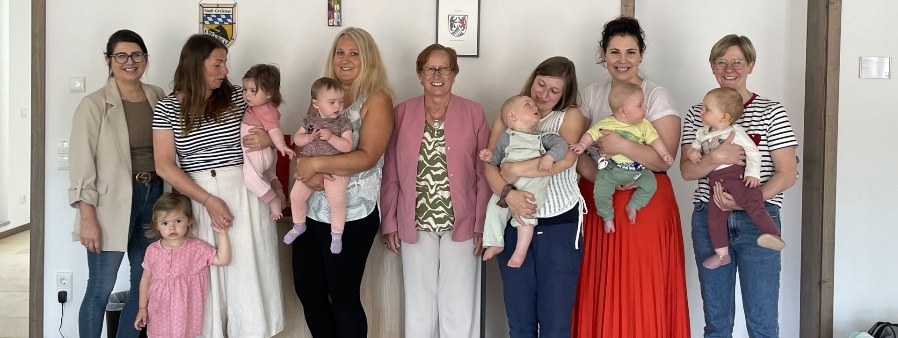 „Familienfoto“: Die fünf „neuen“ Mamas im Caritasverband Freyung-Grafenau e.V. mit Alexandra Aulinger-Lorenz (hauptberufliche Vorständin, li.) und der Ideengeberin und Moderatorin in des 1. Caritas-Babytreffs, Margarethe Aigner (Fachberaterin Mitarbeiter-Pastoral, 4. v. re.)
