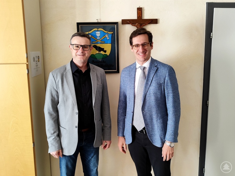 Informierte sich über die kommunalen Infrastrukturprojekte der Gemeinde St. Oswald-Riedlhütte: MdL Dr. Stefan Ebner (rechts) zu Gast bei Bürgermeister Andreas Waiblinger (links)