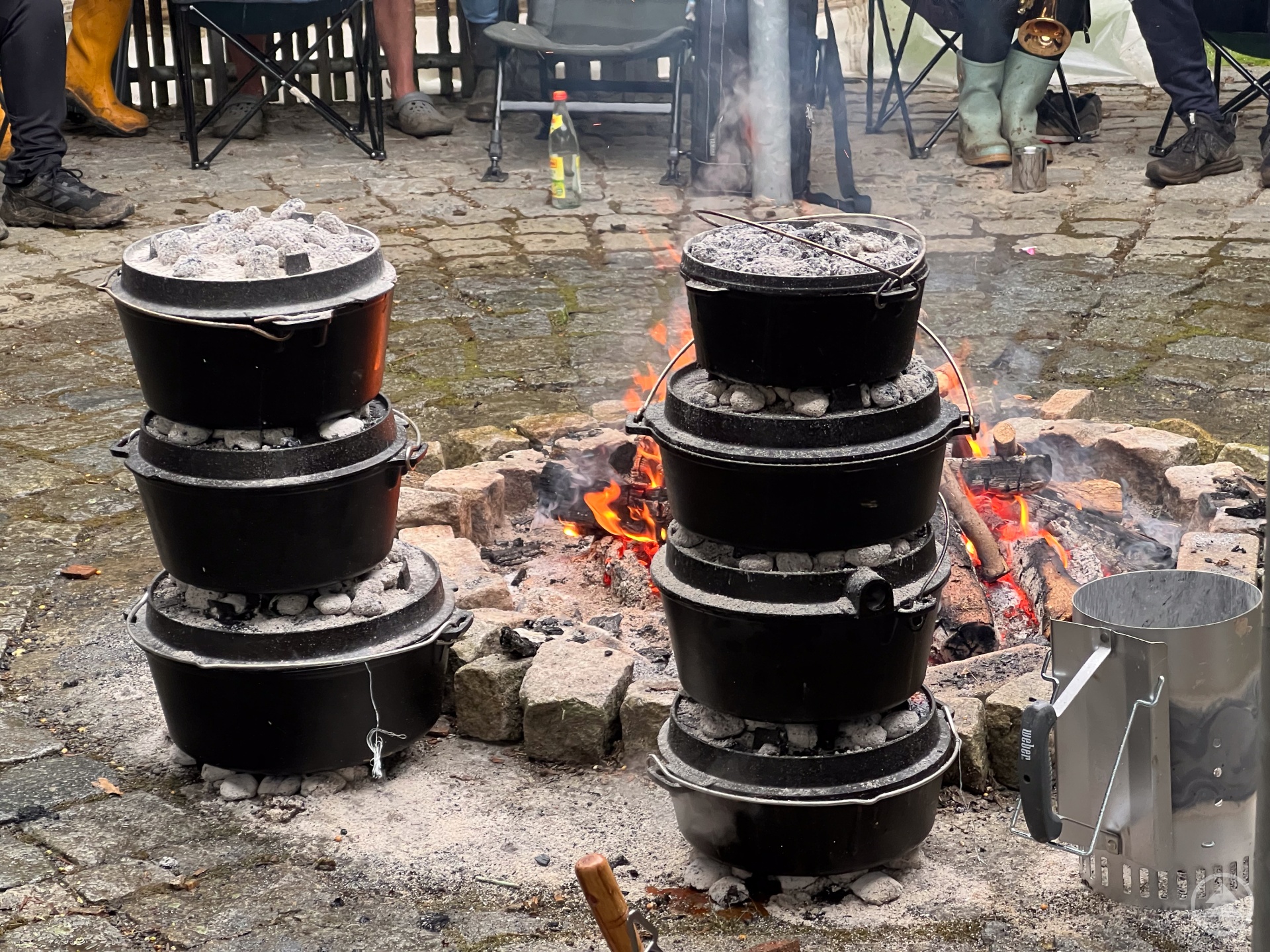 Sieben Dutch Ovens wurden gemeinsam befüllt, um ein ordentliches Abendessen für die hungrigen Camper am Lagerfeuer zu zaubern.