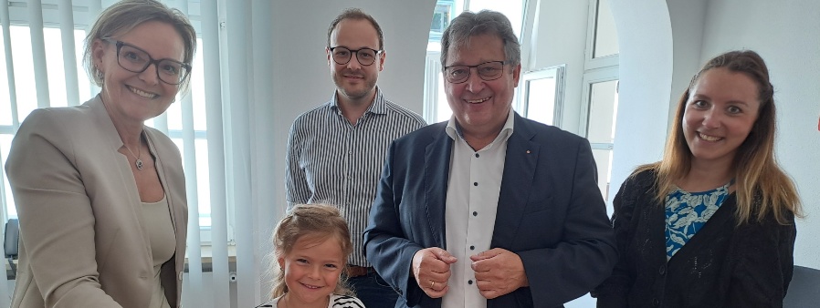 Viermal Glück bei der Restcent-Aktion. Die Losfee Lea Klugseder zog die Gewinner. Die Caritas-Vorstände Andrea Anderlik und Diakon Konrad Niederländer sowie Patrik Lang (2.v.li.) und Melanie Jocham (re.) von der Personalabteilung freuen sich über die Solidarität ihrer Mitarbeiter*innen.