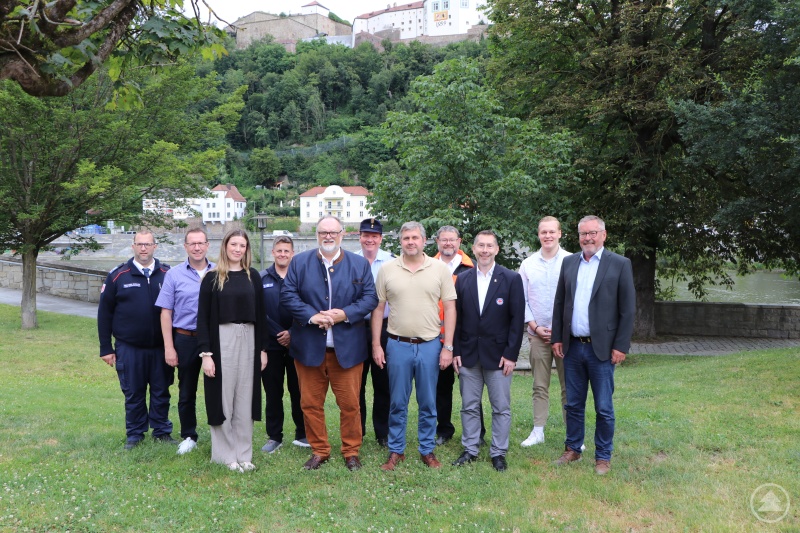 Oberbürgermeister Jürgen Dupper (5. von rechts) gemeinsam mit (v.l.) Michael Walch (Malteser Hilfsdienst), Erik Linseisen (Leiter des Ordnungsamtes der Stadt Passau), Lavinia Schwark (Moltke Sports GmbH), Martin Hanisch (THW), Stadtbrandrat Andreas Dittlmann, Werner von Moltke (Geschäftsführer der Moltke