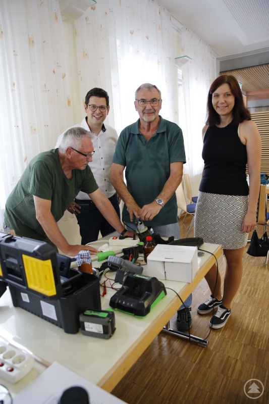 Ludwig Vater (v.l.) wurde mit einer Lötstelle wieder „trimmschnitttauglich“ gemacht. Da freuen sich auch Bürgermeister Martin Pichler, Initiator Manfred Duschl und Eva Osterer, die sich als Klimaschutzmanagerin im Landkreis um mehr Nachhaltigkeit kümmert.