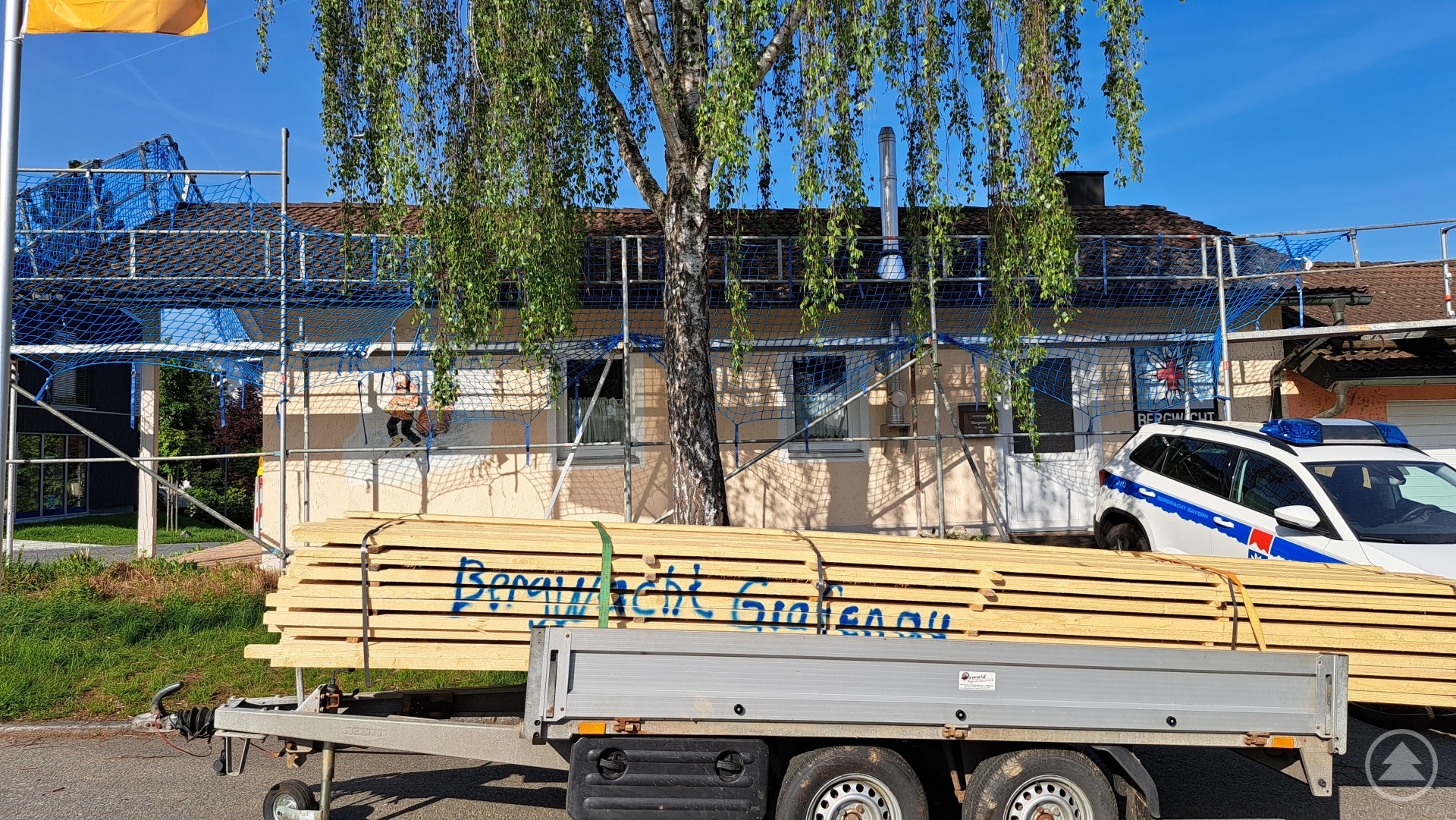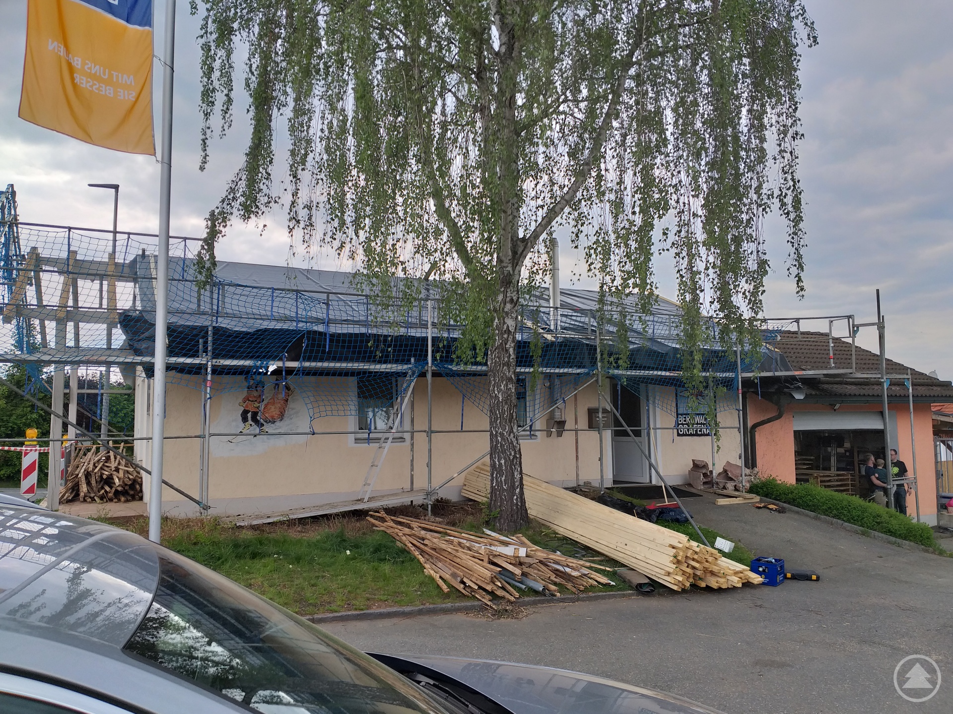 Gleich zu Beginn bekamen die Kameraden eine sehr erfreuliche Rückmeldung: die Firma Holz Schiller stellt das erforderliche Holz für den Dachstuhl, die Firma DURAlife by Schiller die erforderliche Grundierung und Farbe für das neue Holz ohne Berechnung zur Verfügung.