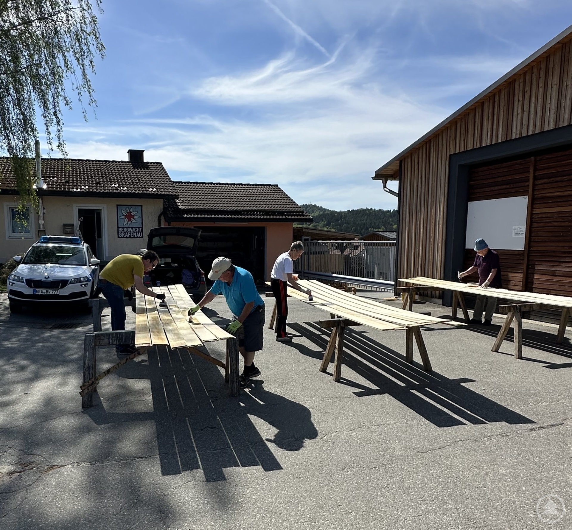 Die Bergwachtler grundieren und streichen das neue Holz mit der, von der Firma DURAlife by Schiller zur Verfügung gestellten Grundierung und Farbe.