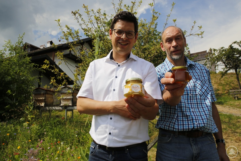 Schönberg hat mit drei Stöcken fleißiger Bienen eine besondere kommunale Leistungssparte. In dem kleinen Hanggelände stehen Obstbäume, blüht eine Blumenecke, informieren Tafeln über Bienen, Natur und Honiggewinnung. Da summt und brummt es mächtig, weil die geflügelten Bestäuber am Heimweg jede Menge Last dabeihaben. Stefan Süß schätzt, dass heuer etwa 100 Kilo Honig geerntet werden können. Etwas Kopfzerbrechen macht ihm, der auch selbst imkert, dass die Melozitose heuer Fahrt aufgenommen hat.