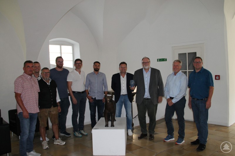 Der Vorsitzende des Haferlfestvereins Markus Rohmann (4. von rechts) übergibt Oberbürgermeister Jürgen Dupper (3. von rechts) das diesjährige Haferl im Beisein weiterer Vereinsvertreter