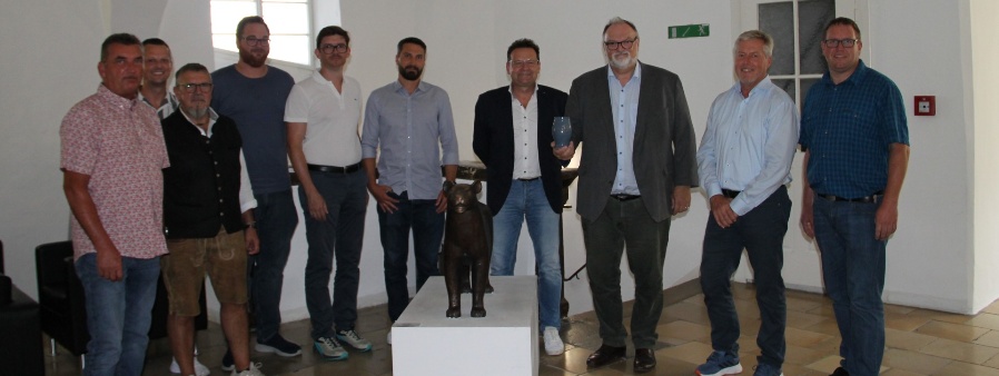 Der Vorsitzende des Haferlfestvereins Markus Rohmann (4. von rechts) übergibt Oberbürgermeister Jürgen Dupper (3. von rechts) das diesjährige Haferl im Beisein weiterer Vereinsvertreter