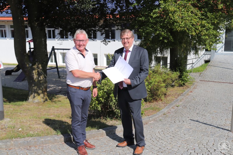 Der Leiter des Amtes für Ländliche Entwicklung (ALE) Niederbayern, Hans-Peter Schmucker (rechts), überreicht das offizielle Beendigungsschreiben zur Dorferneuerung Nottau an Obernzells Bürgermeister Ludwig Prügl.