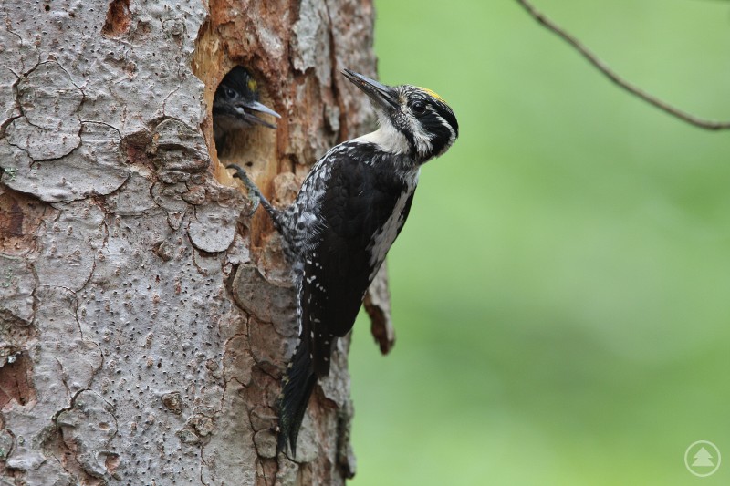 Das Vorkommen des Dreizehenspechtes in Bereichen wo auch der Buchdrucker aktiv ist, überrascht dagegen weder Jochen Linner noch Ranger Mario Schmid. „Unsere insgesamt sieben Spechtarten im Nationalpark profitieren vom Borkenkäfer, da sie unter der Rinde abgestorbener Bäume viel Nahrung finden und in das Totholz ihre Bruthöhlen bauen können“, erklärt Schmid bereits mit einem Fernglas in der Hand. So können er und Jochen Linner das Geschehen an der Dreizehenspechthöhle aus der Ferne beobachten. Alle paar Minuten fliegen die Elterntiere mit einem Schnabel voller Insektenlarven heran.