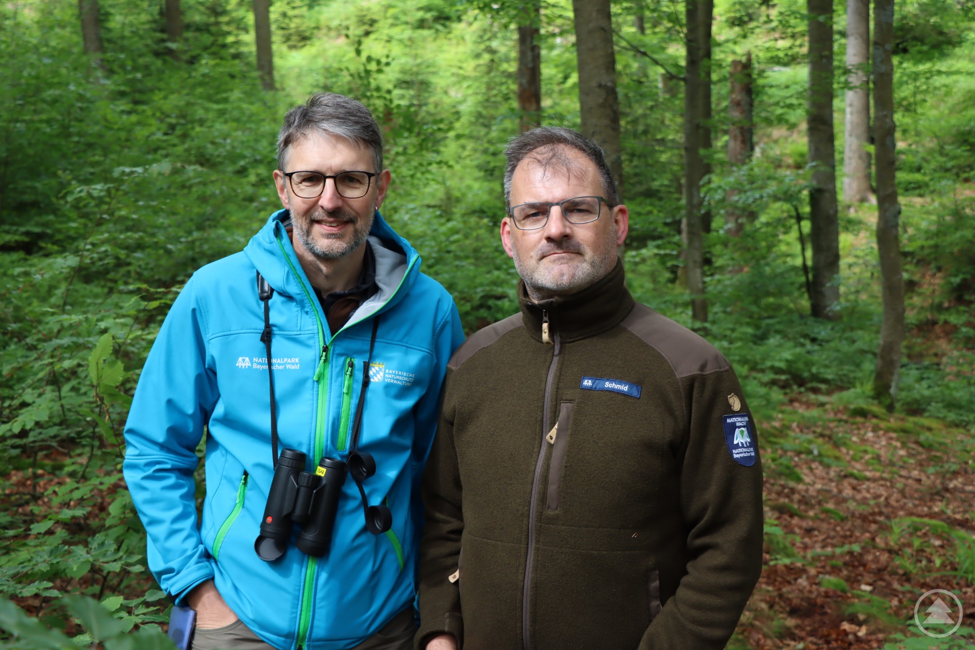 Überprüften gemeinsam eine Nisthöhle des seltenen Dreizehenspechtes in der Managementzone des Nationalparks, Jochen Linner aus der Nationalparkverwaltung (links) und Ranger Mario Schmid.