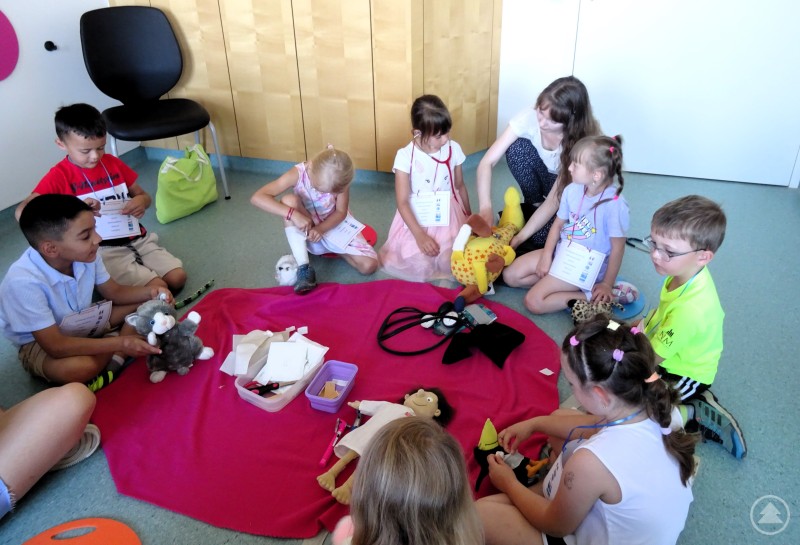 In der Teddysprechstunde untersuchten die Kinder ihre mitgebrachten Kuscheltiere als Patienten unter Anleitung von Amtsärztin Dr. Karin Drachsler und konnten mit dem Stethoskop auch ihren eigenen Herzschlag hören.