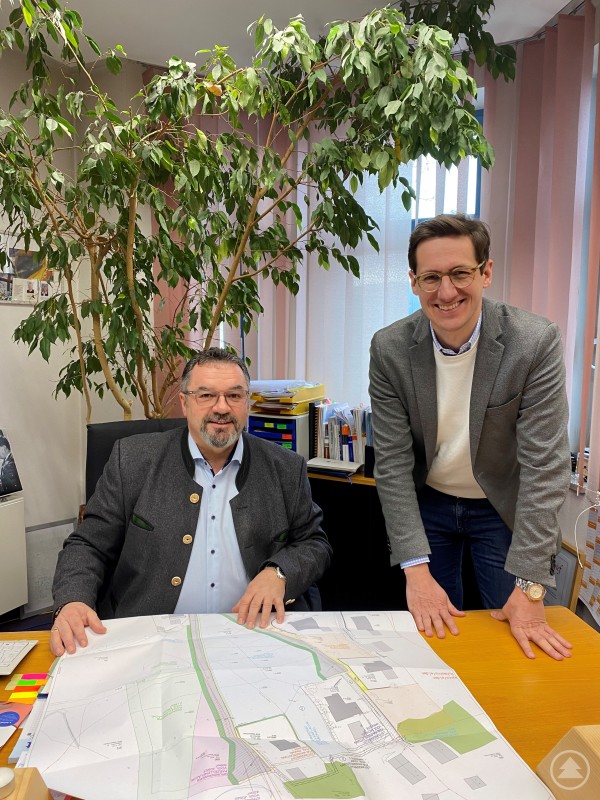 Beim Antrittsbesuch von MdL Dr. Stefan Ebner im Rathaus Ruhmannsfelden präsentierte Bürgermeister Werner Troiber (l.) seinem Gast die Pläne zur Umsetzung eines Gewerbegebietes.