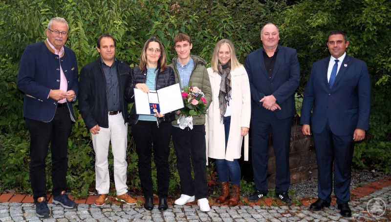 Landrat Josef Laumer, Oliver Grimm, Nicole Grimm, Lukas Grimm, Elisabeth Gruber, MdB Erhard Grundl und Bürgermeister Andreas Urban (von links).