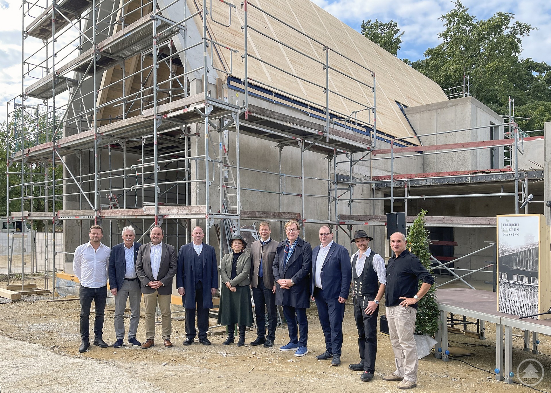 Maximilian Hummel, Nachfahre von Berta Hummel (von links), Bürgermeister a. D. Josef Auer, Massings Bürgermeister Christian Thiel, Museumsleiter Timm Miersch, Mia Goller, MdL, Bezirkstagspräsident Dr. Olaf Heinrich, Dr. Thomas Pröckl, Bezirkstagsvizepräsident, Landrat des Landkreises Rottal-Inn Michael Fahmüller, Heinz Strobl, Geschäftsführer der Firma Strobl Bau und Architekt Prof. Markus Frank stehen vor dem Rohbau des neuen Gebäudes für die Berta-Hummel-Sammlung.