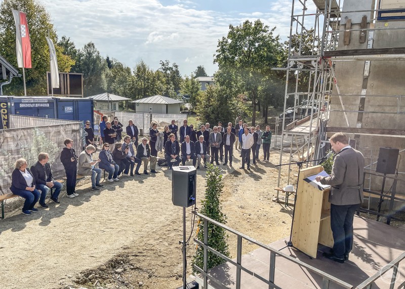 Das Gebäude für die Berta-Hummel-Sammlung auf dem Gelände des Freilichtmuseums Massing nimmt Gestalt an, Rohbau und Dachstuhl stehen. Anlässlich dessen hat der Zweckverband Niederbayerische Freilichtmuseen am Mittwoch zum Richtfest auf die Baustelle geladen. In festlichem Rahmen zeigten sich die Verantwortlichen der Zweckverbandsmitglieder, aber auch der Leihgeber der Berta-Hummel-Sammlung zufrieden mit dem Fortgang der Bauarbeiten, die seit Oktober vergangenen Jahres laufen. Bezirkstagspräsident und Verbandsvorsitzender Dr. Olaf Heinrich: „Hier wird das Werk von Berta Hummel eine würdige Heimat finden.“