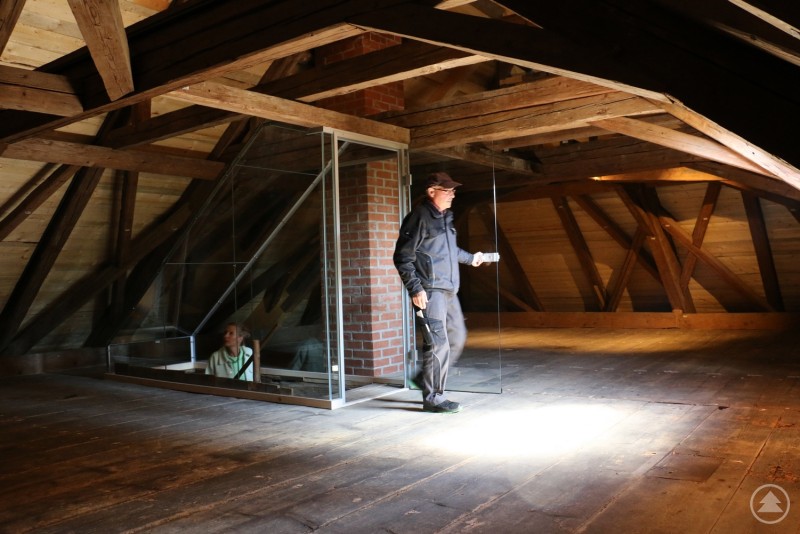 Lange Zeit ging man davon aus, dass man den Besuchern den Dachboden des Hauses nicht zeigen kann, auch hierfür wurde noch eine Lösung gefunden. Aus brandschutztechnischen Gründen darf der Dachboden nicht betreten werden, so wurde kurzerhand eine Glasabtrennung angebracht.  Zimmerer Franz Blöchinger zeigt sich zufrieden, „es wäre unglaublich schade gewesen, wenn wir die Besonderheit dieser Bauweise nicht hätten zeigen dürfen. Es handelt sich um einen freitragenden Dachstuhl ohne Säulen, stützenfrei und umlaufend auf einem Schwellkranz war der komplette Dachstuhl benutzbar“ So konnte man diesen Platz vollumfänglich nutzen. Tausende Holznägel wurden hierfür angefertigt, es befindet sich kein Metallteil in diesem Dachstuhl.