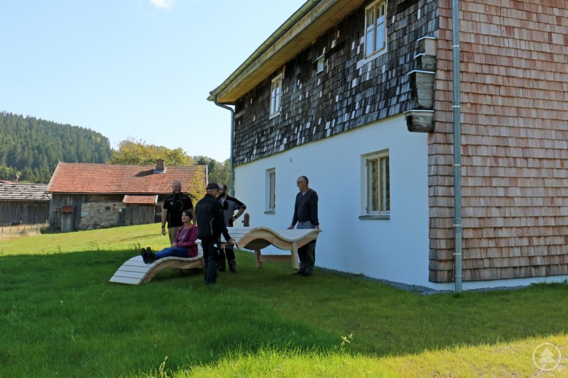 Tische, Stühle und bequeme Holzliegen stehen hinter dem Gebäude und laden ein zu einer kleinen Rast mit herrlichem Blick in die Wälder. Nach dem Schleppen und Aufbau der Liegen trafen sich die Museumsmitarbeiter in der gemütlichen Wirtstube zu einem ersten Feierabendbier.