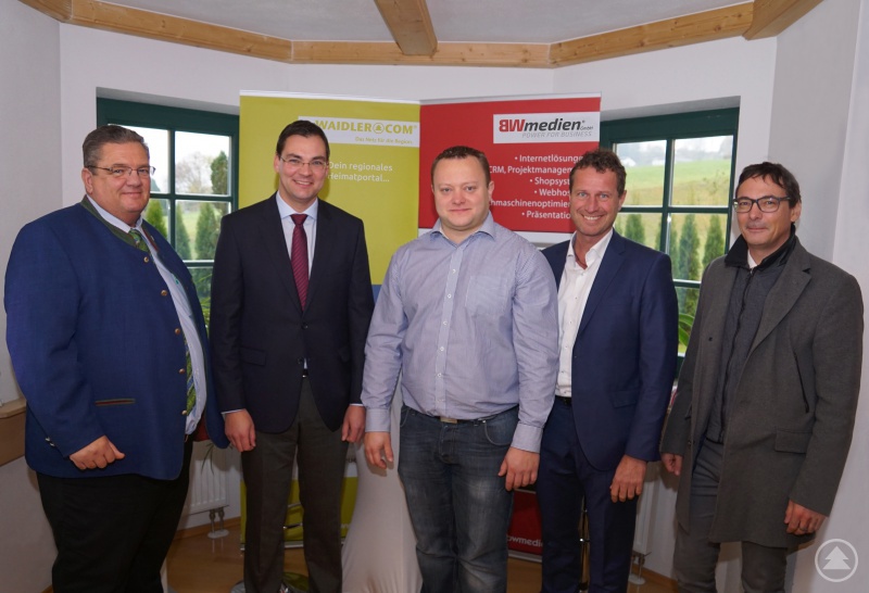 Betriebsbesuch in den Räumen des IT- und Internetallrounders BWmedien in Haus i. Wald. Von links nach rechts: Grafenaus Bürgermeister Max Niedermeier, Landrat Sebastian Gruber, Geschäftsführer Stefan Behringer, Wirtschaftsreferent Ralph Heinrich und Regionalmanager Stefan Schuster.