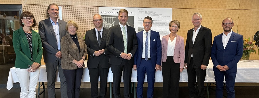 Sie verabschiedeten den scheidenden Direktor Fitz Geisperger (4. v. r.) in den Ruhestand: Dr. Marion Honka (v. l.), Vorsitzende des Berufsverbandes Bayer. Hörgeschädigtenpädagogen, Rainer Fauser, Ltd. Regierungsschuldirektor, Barbara Unger, stv. Landrätin des Landkreises Straubing-Bogen, Nachfolger Matthias Räß, Bezirkstagspräsident Dr. Olaf Heinrich, Karin Mayr, ständige Vertreterin des Direktors, Oberbürgermeister von Straubing Markus Pannermayr und Jakob Spitzauer, Personalratsvorsitzender.
