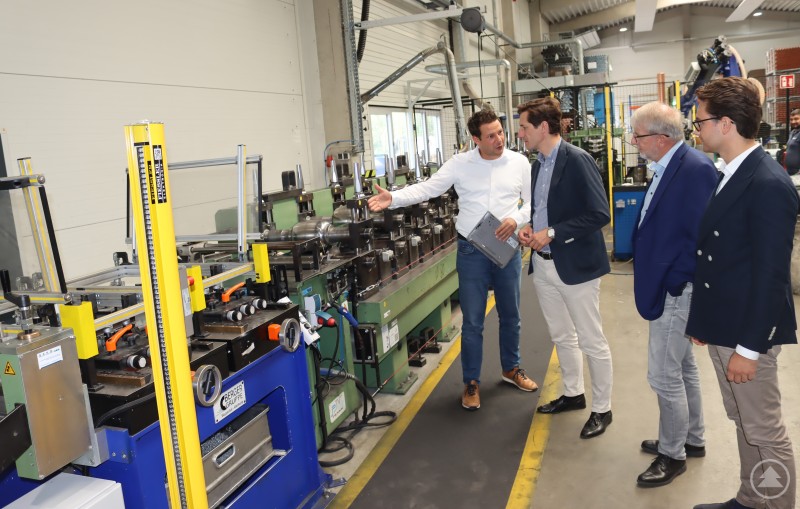 Beim Firmenrundgang in den Produktionshallen von Zambelli erläuterten die beiden Geschäftsführer Johannes Ranzinger (li.) und Andreas von Langsdorff (2. v. re.), zusammen mit Mitgesellschafter Constantin Zambelli (re.) die Funktionsweise der Produktion von Ablaufrohren (im Hintergrund).