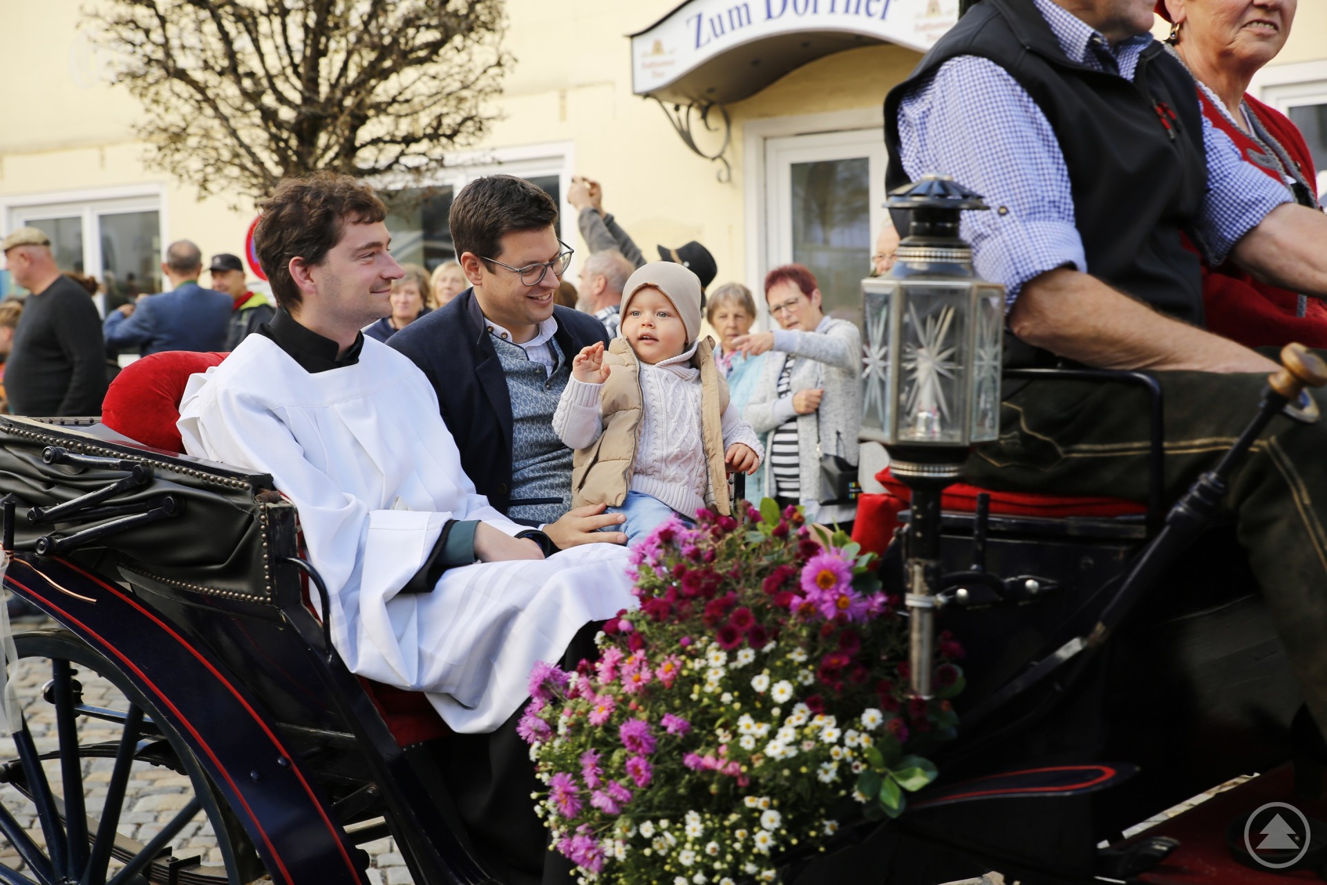 Pfarrer Simon Steinbauer kam mit Bürgermeister Martin Pichler und dem kleinen Leopold in der Festkutsche gefahren und segnete später Rösser, Menschen und Bulldog, damit auch das nächste Jahr gedeihlich und sicher verlaufen möge.