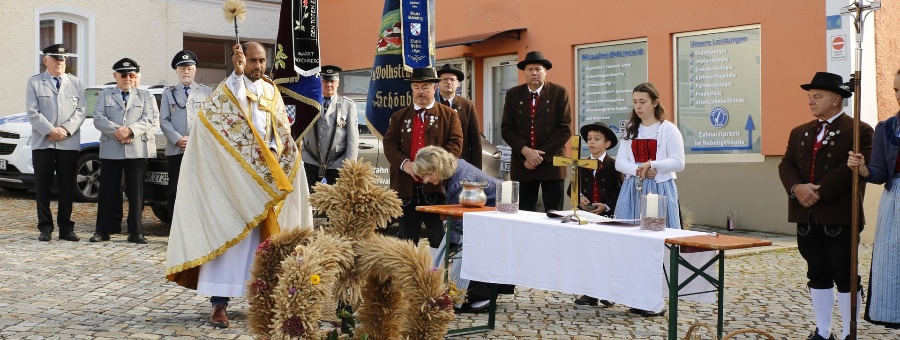 Die Erntekrone segnen, das ist guter Auftakt vor dem Fest. Pfarrvikar Antony Kurisingal durfte dies am Luitpoldplatz zusammen mit Vereinsabordnungen und Gläubigen tun, bevor es zum Gottesdienst in die Pfarrkirche ging. In der Lesung wurde die Hoffnung zum Ausdruck gebracht, dass Gottes Schöpfung schon alles wie wunderbar ordnen würde, dass jeder Mensch seine Ernte einbringen könne. Nach der Messe konnten sich die Gläubigen Erntesträußchen als das goldene Strahlen der Felder mit nach Hause nehmen.