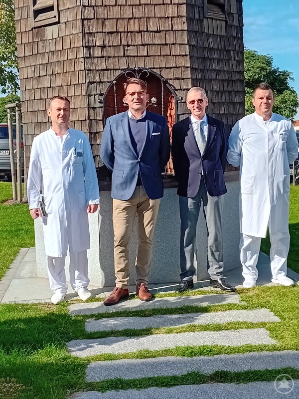 Der neue Chefarzt Dr. Andrzej Gabrusiewicz (2. von links) und die beiden Oberärzte MUDr. Radovan Pollák (links) und dr. Tibor Fentös (rechts) verabschieden Dr. Franz Schreiner in den Ruhestand.