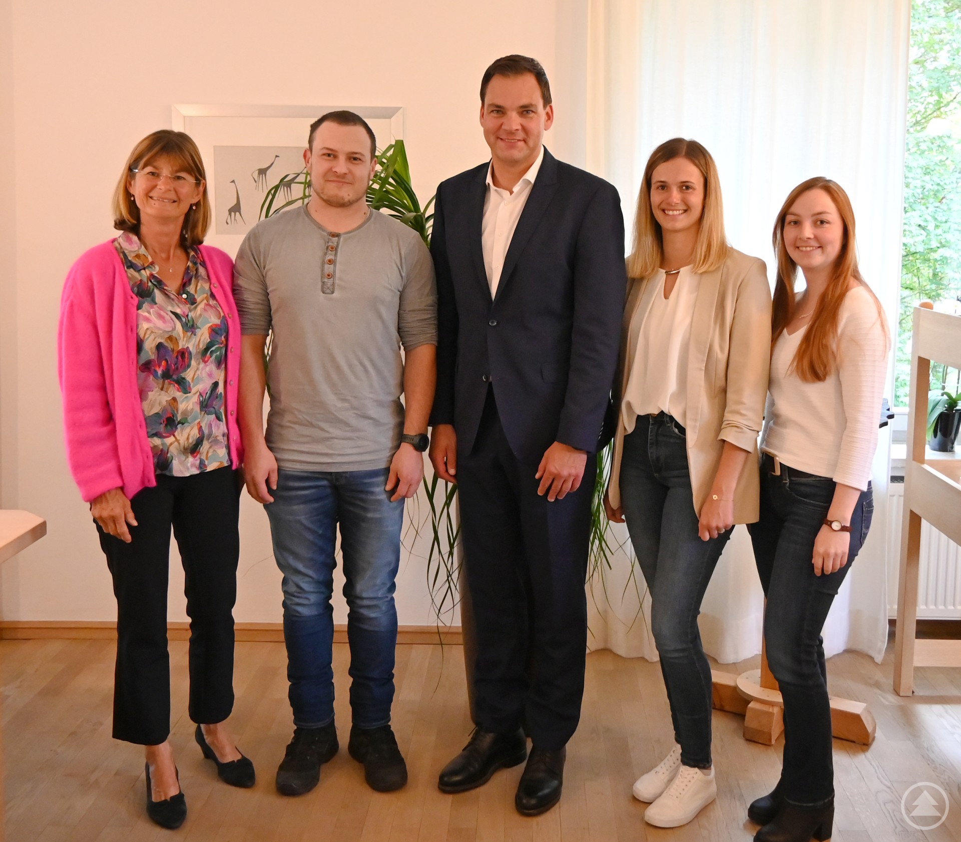 Neben Landrat Sebastian Gruber (Mitte) gratulierten auch (von links) Abteilungsleiterin Karen Schier, Sabrina Krückl von der Personalverwaltung sowie Fachbereichsleiterin Dr. Lena Mautner Hygienekontrolleur Manuel Ranzinger zu seinen hervorragenden Prüfungsergebnissen