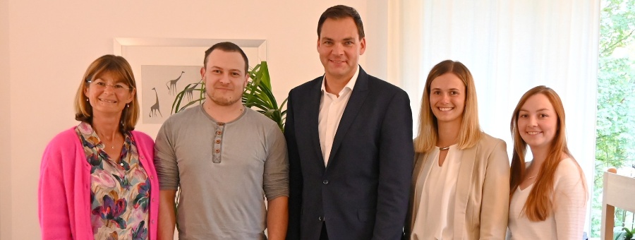 Neben Landrat Sebastian Gruber (Mitte) gratulierten auch (von links) Abteilungsleiterin Karen Schier, Sabrina Krückl von der Personalverwaltung sowie Fachbereichsleiterin Dr. Lena Mautner Hygienekontrolleur Manuel Ranzinger zu seinen hervorragenden Prüfungsergebnissen