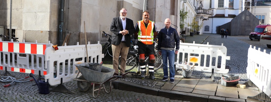 Oberbürgermeister Jürgen Dupper begutachtet den Fortschritt am Residenzplatz: „Unsere historische Altstadt hat viele Besonderheiten. Nicht zuletzt charakterisieren die kleinen Gassen, die Ausgestaltung bzw. Beschaffenheit der Straßen und Flächen aber auch die Wegführung das frühere Stadtzentrum. Es ist durchaus eine Herausforderung, in Abwägung mit dem Denkmalschutz eine Verbesserung für Menschen mit Beeinträchtigung oder auch mit Kinderwägen zu erreichen. Wir werden jedenfalls alle Möglichkeiten ausschöpfen, um einen problemlosen und sicheren Zugang zu unserer Altstadt zu ermöglichen.“