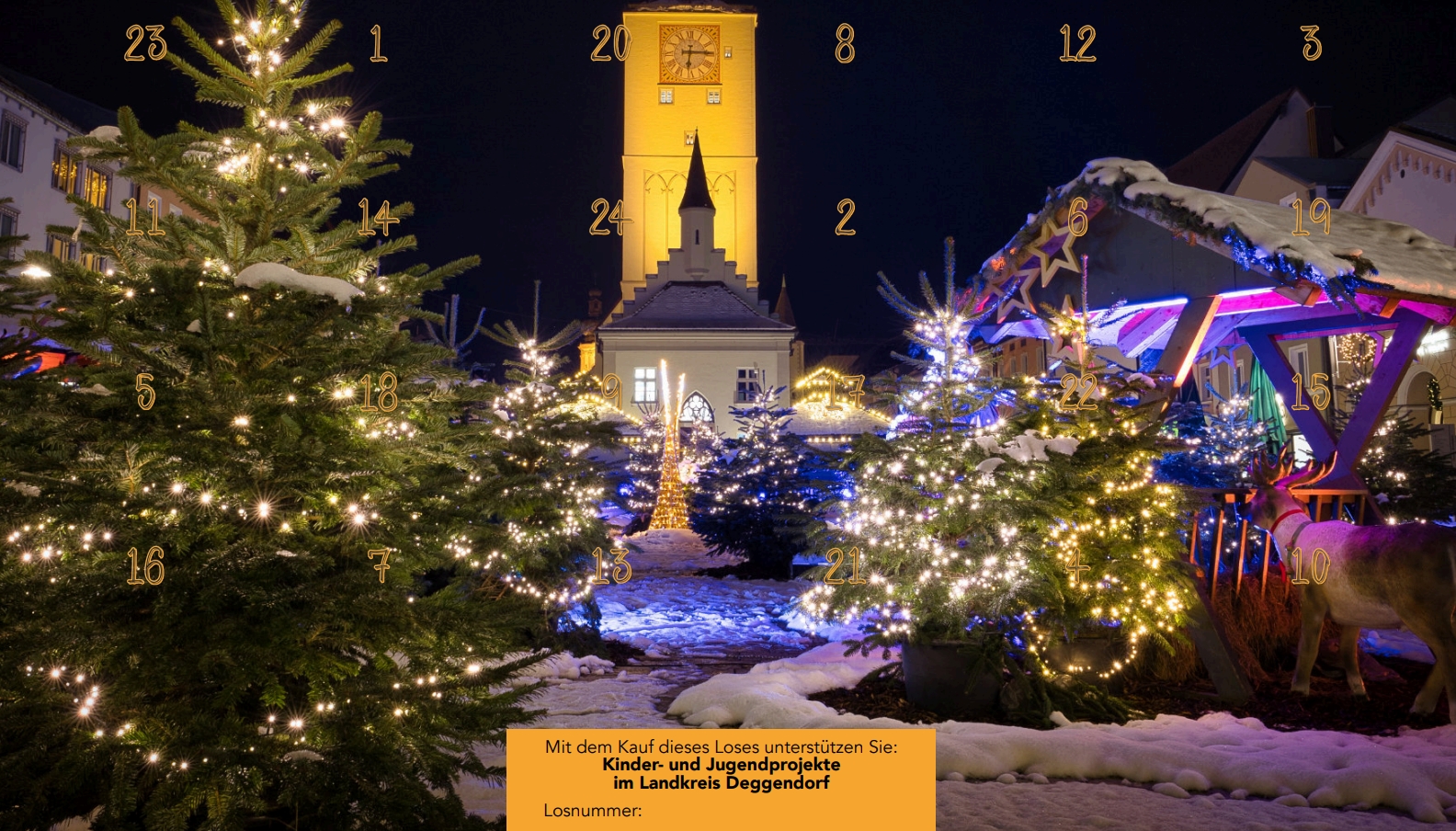 Für den Lospreis von unverändert 10 Euro erwerben die Käufer die Chance auf einen von 580 (Vorjahr: 502) Preisen. Die Auflage des Kalenders beträgt in diesem Jahr erstmals 4000 Stück, so dass weiterhin rechnerisch rund jedes 7. Los einen Gewinn enthält. Hinter jedem Türchen stehen die Gewinne, die an diesem Tag vergeben werden, wie z. B. eine wertvolle Goldmünze, vier iPads, ein iPhone, eine Playstation-Spielekonsole, 2 Tickets für ein Spiel des FC-Bayern, 2 Wochenenden mit einem BMW sowie Gutscheine der Deggendorfer Gastronomie und des Einzelhandels, die Sponsoren zur Verfügung gestellt haben. Neben diesen Preisen werden unter anderem auch zahlreiche Deggendorf-Gutscheine verlost. Dafür hat der Rotary Club Deggendorf auch selbst 2.500 Euro zur Verfügung gestellt, um dem lokalen Einzelhandel und der Gastronomie gezielt zu helfen.