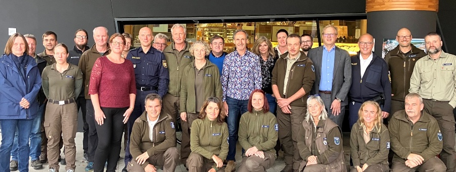 Erster Polizeihauptkommissar Markus Mühlbauer und Erster Kriminalhauptkommissar Manfred Scharf von der Polizeischule Ainring lieferten den fachlichen Input und zeigten sich beeindruckt vom regen Interesse der anwesenden Ranger und Rangerinnen. Zu der Fortbildung waren auch Vertreter der örtlichen Polizeidienststellen sowie der Unteren Naturschutzbehörden der Landratsämter Freyung-Grafenau und Regen geladen. „Uns verbindet bereits eine enge und gute Zusammenarbeit“, so Elke Ohland, Leiterin des Sachgebietes Regionales Netzwerk, Besuchermanagement und Nationalparkwacht. „Da ist diese Fortbildung eine gute Gelegenheit, die Abstimmung und Kommunikation zwischen unseren Behörden noch weiter zu verbessern.“