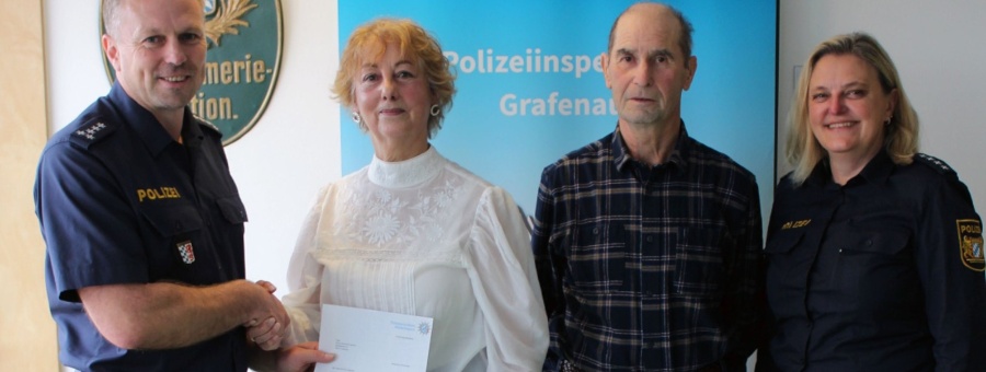 Einen äußerst erfreulichen Termin hatte die Dienststellenleitung der Polizei Grafenau am Mittwochnachmittag zu absolvieren. Zu Gast war das Ehepaar Sieghart aus Grafenau mit deren Hilfe zwei Callcenter-Betrüger festgenommen werden konnten.