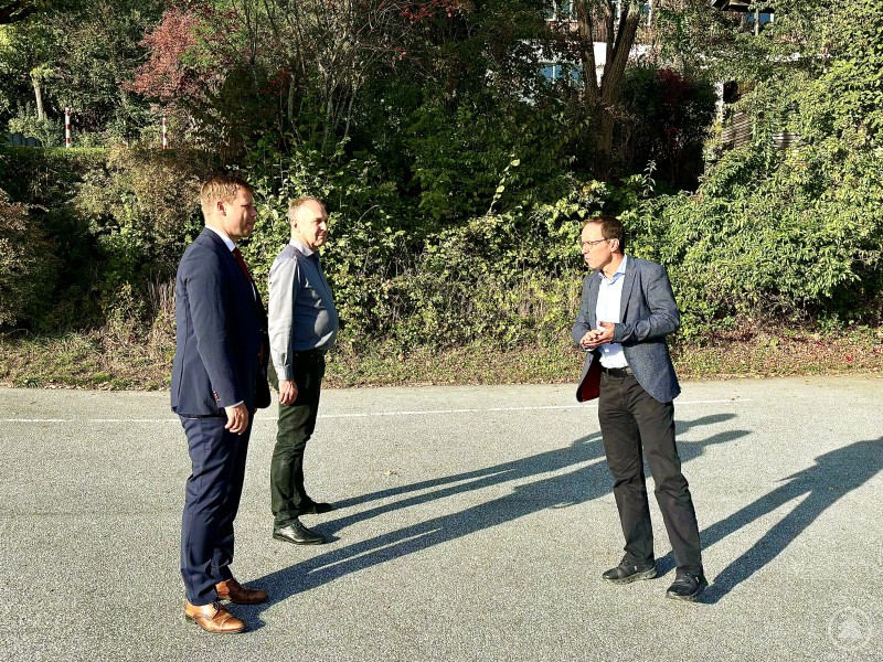 Auf diesem Areal entsteht der Anbau an das bestehende Gebäude der Grund- und Mittelschule Perlesreut: (von links nach rechts) Bezirkstagspräsident Dr. Olaf Heinrich, Schulleiter Johann Friedl und Bürgermeister Gerhard Poschinger beim Ortstermin