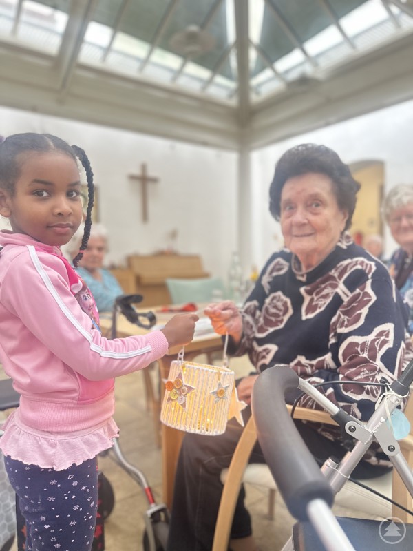 Mit leuchtenden Laternen und fröhlichen Liedern gingen die Kinder durch das Seniorenheim und erfreuten die dortigen Bewohner. Im Speisesaal des Hauses angekommen, wartete ein größeres Publikum auf die singenden Kinder. Viele der Zuhörer kannten den Text „Laterne, Sonne, Mond und Sterne“ und sangen munter mit. Eine Laterne brachten die Kinder als Geschenk mit und überreichten sie dem