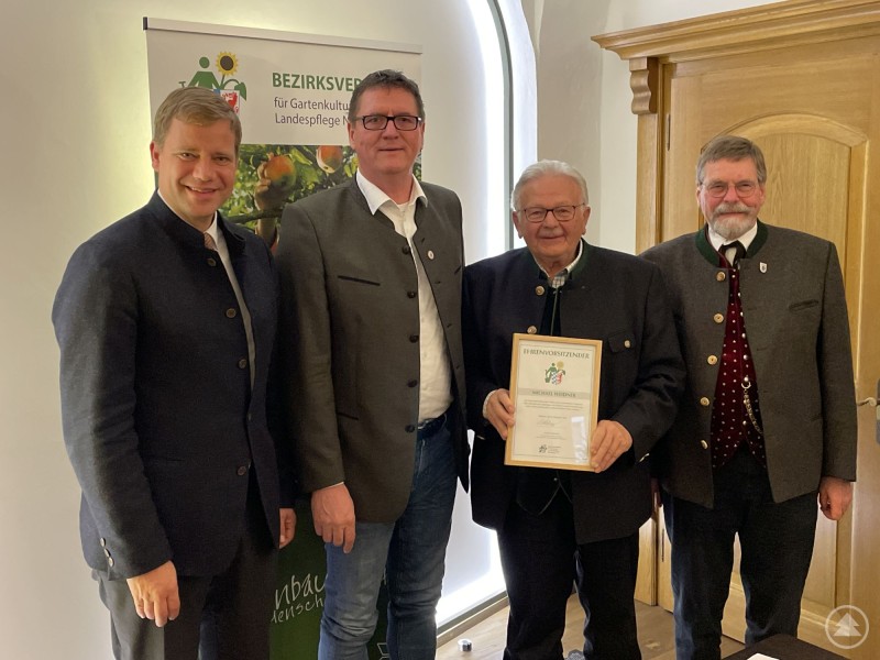 Bezirkstagspräsident Dr. Olaf Heinrich (v.l.) mit dem neuen Bezirksvorsitzenden Harald Hillebrand, seinem Vorgänger Michael Weidner und dem Präsidenten des Landesverbandes für Gartenbau und Landschaftspflege, Wolfram Vaitl. Foto: Bezirk Niederbayern, Manuela Lang